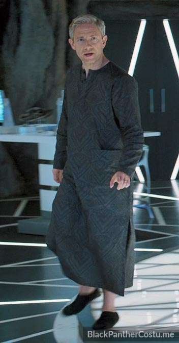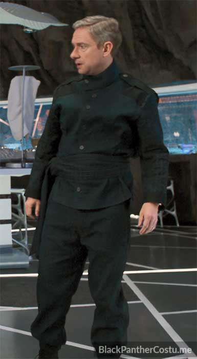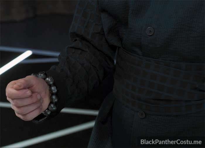 Everett K Ross wears a charcoal gray seersucker tunic shirt with black reinforcement patches and grid pattern sleeves. Grid-pattern sash and black pants.