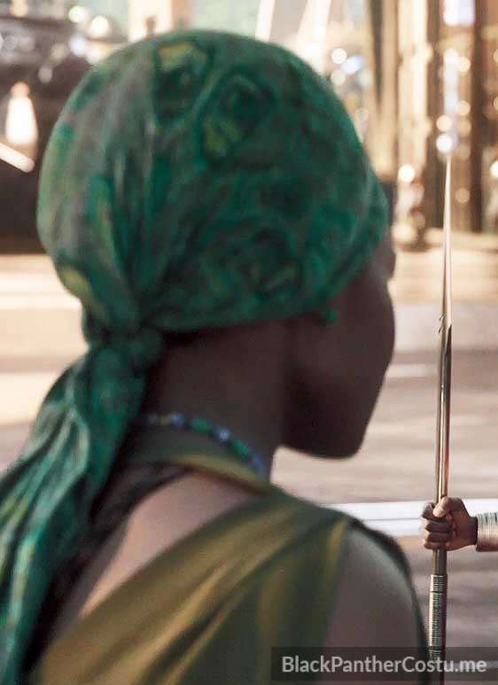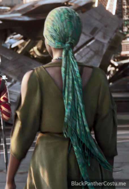 “But she also has a high-wattage fight scene in a casino in South Korea, for which she wears a striking green, high-neck, open-shoulder dress. Ms. Carter and her team designed the fabric and had it 3-D-printed. They started with a kente cloth, “extracted the line work and created a pattern, hand-painted it,” she said. It’s covered with Wakandan text — boxes with slashes inside — and it’s sexy but not revealing. “It was her Bond Girl moment,” Ms. Carter said, “but also, she could fight and move in it, and it wasn’t constricting.” – NY Times