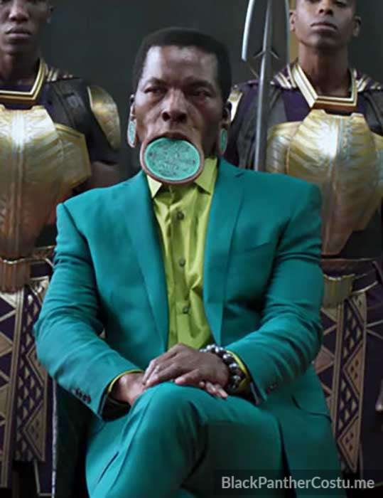 “This elder statesman of Wakanda (played by Isaach de Bankolé) may not get much screen time, but his look is unforgettable, one of Carter’s savviest updates of African tradition and contemporary high fashion. “We wanted to connect him to his tribe by giving him his green color, and I remember researching the fashion designer Ozwald Boateng and he has a green suit that has this wonderful tribal print in it all over,” said Carter. The Ghana-descended Boateng is one of Britain’s best-known fashion designers, and Carter called him up in London to ask if he could adapt his suit for the film: “He said, ‘The fabric is made in Milan and takes six months to hand-make it.’ I was like, ‘Seriously? I have two weeks!’ So I just thought, Okay, let me just buy something off the rack.” Fortunately, Carter found the Boateng suit in stores, and matched it with a shirt that’s also from the designer. “Boateng has such an elegance to his clothes, and such a beautiful craftsmanship to the work,” Carter said.