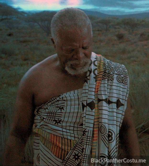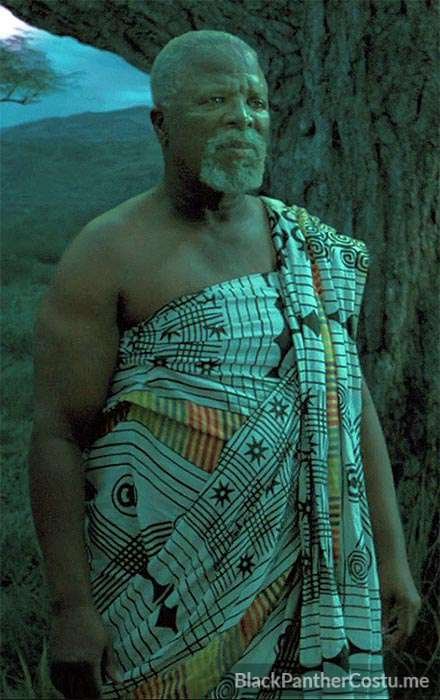 T’Chaka wears a simple wrap outfit – white printed kente cloth.