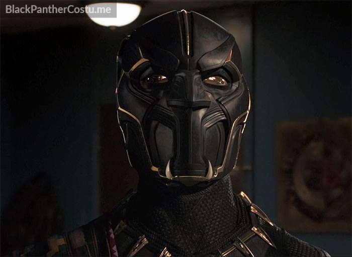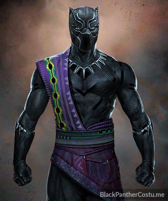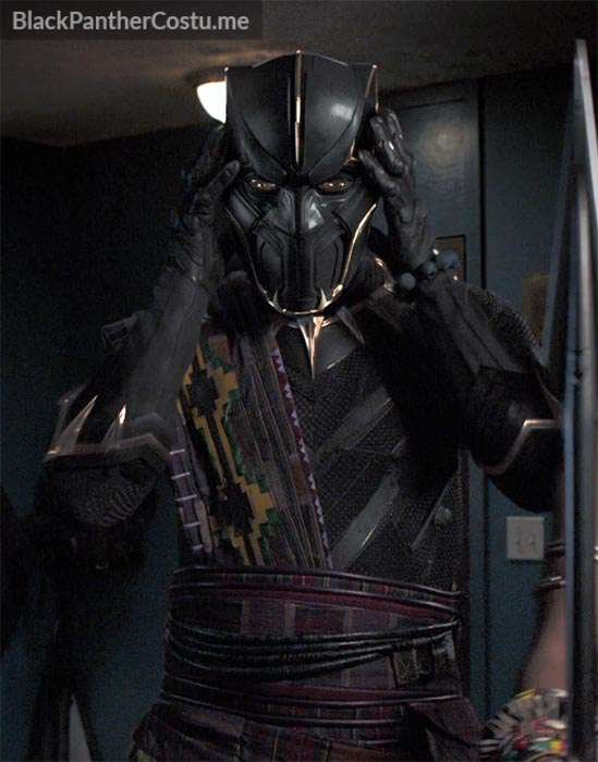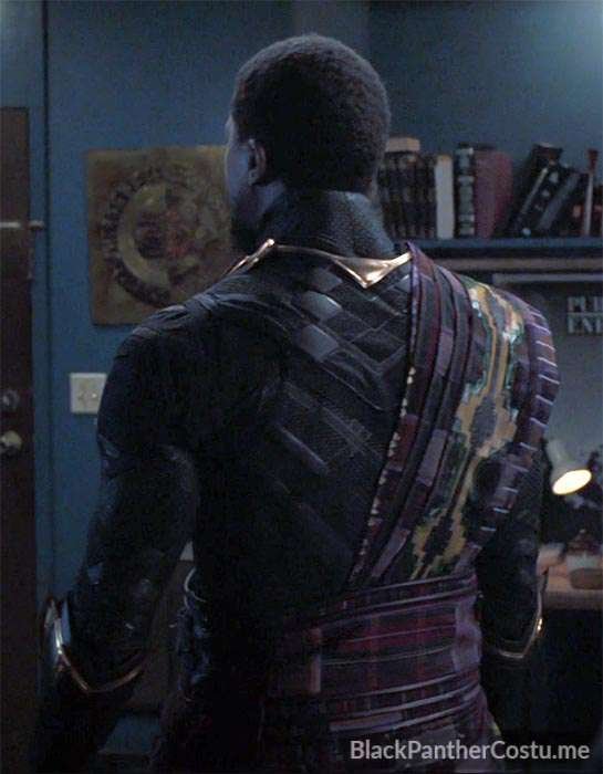 Young T’Chaka appears in an Oakland apartment. The Panther suit is the same suit T’Challa wears early in the Black Panther film (the Captain America: Civil War suit) but it’s covered with purple kente cloth over shoulder and hips. The mask appears to be unique to T’Chaka.