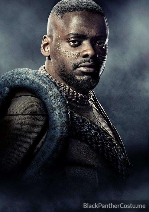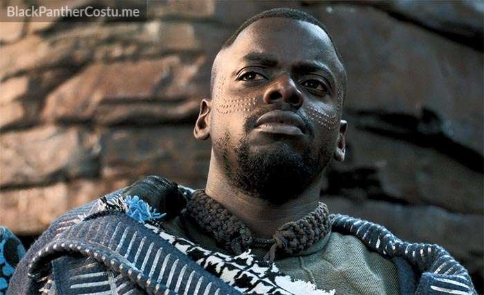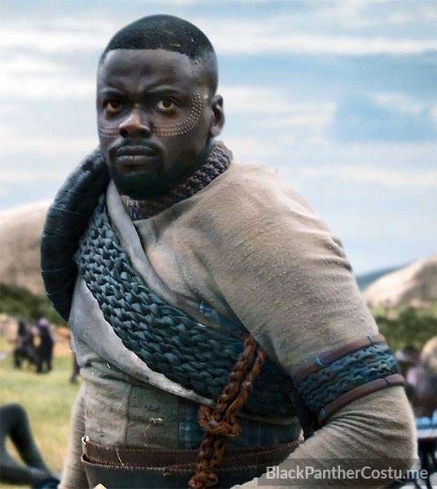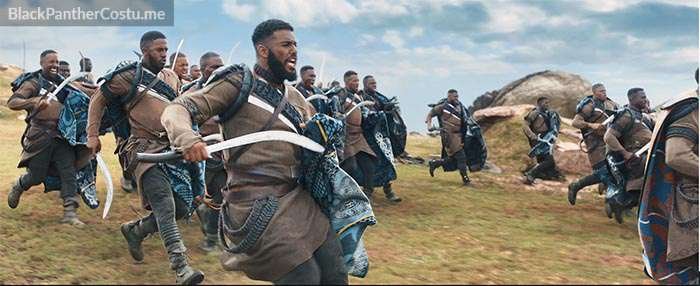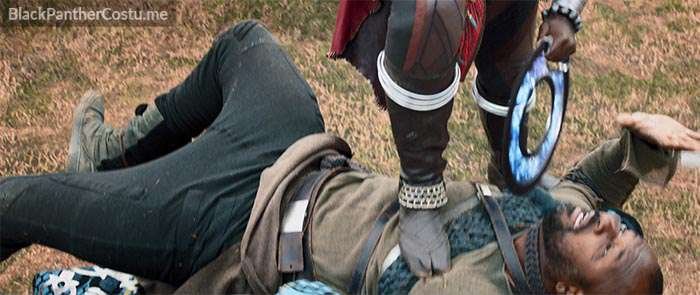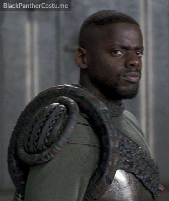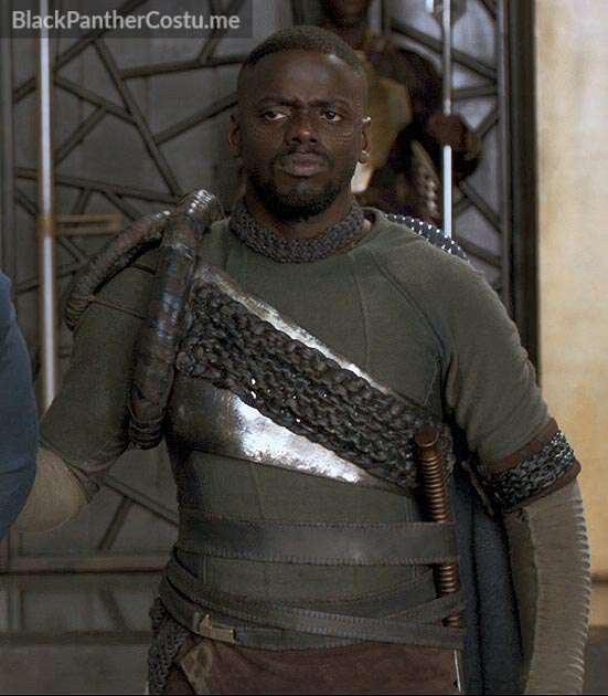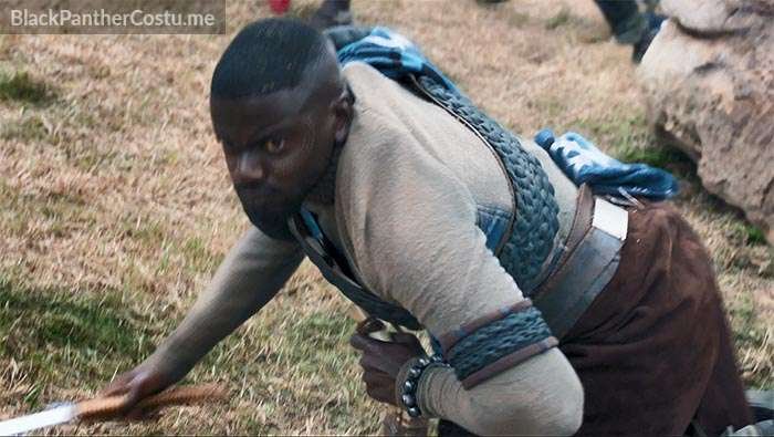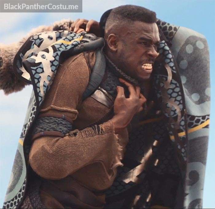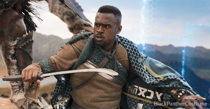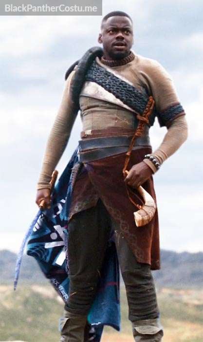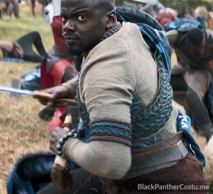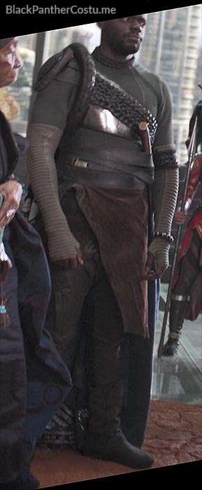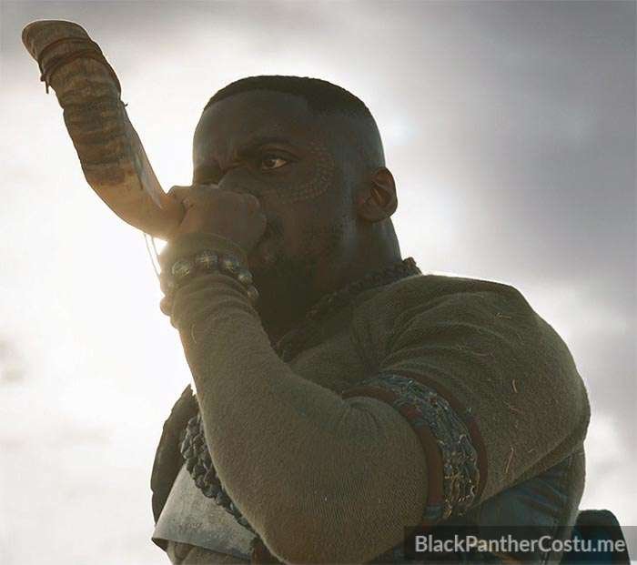 W’Kabi’s outfit here seems very similar. However, he appears to be wearing black pants (they look like black, ribbed-knee joggers) and he has a horn attached to his side. No arm warmers.