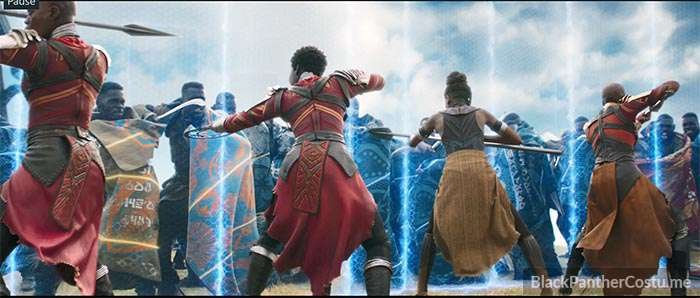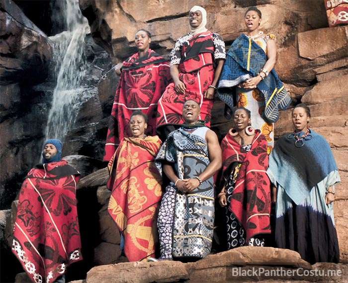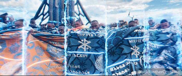 The most characteristic piece on their costumes is the Basotho blanket, which was customized for the film with metallic foil printed designs, mostly Adinkra symbols and Modern Wakandan. Interestingly, the metallic foil is supposed to be vibranium, which gives the blankets special protective powers.