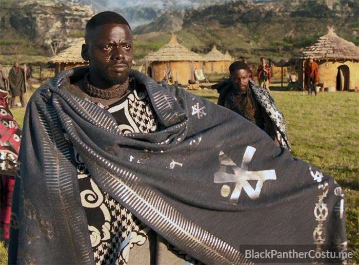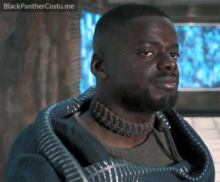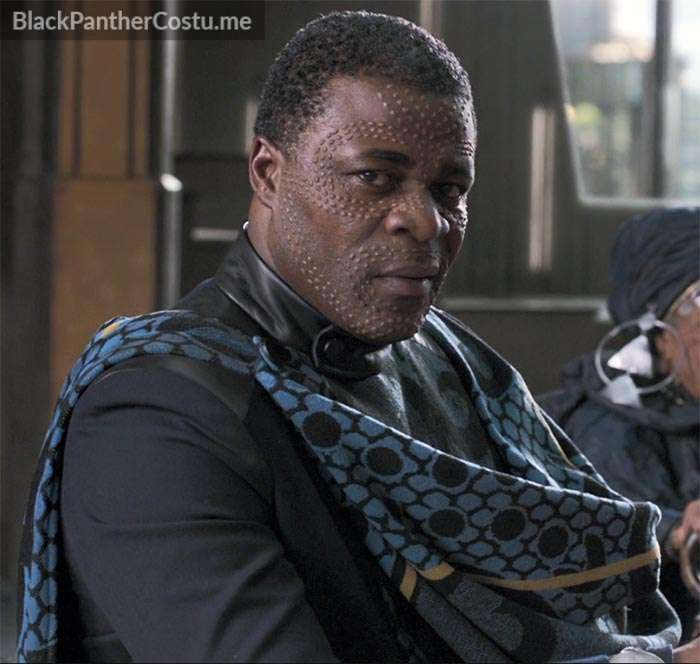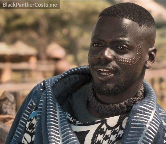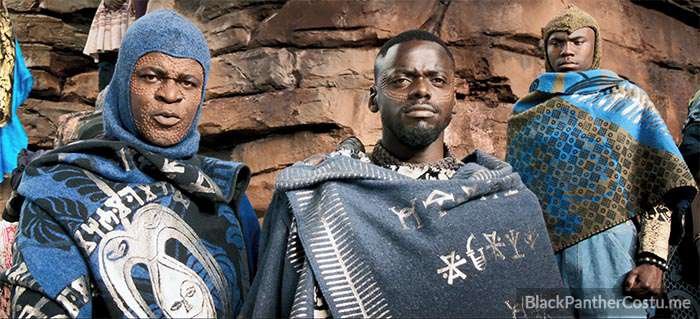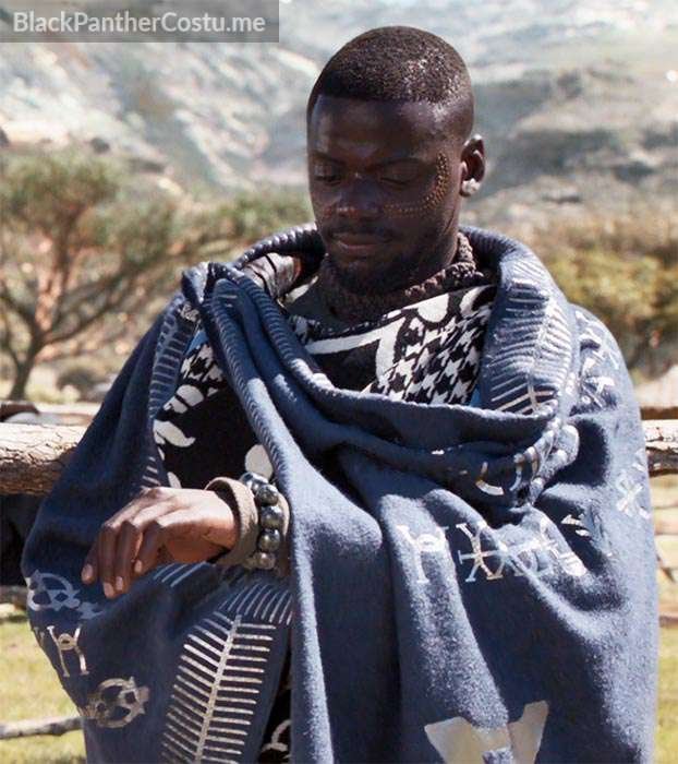 In a few scenes in Black Panther, W’Kabi wears two blankets. His unique blue blanket is on the outside, with another blanket (one sporting a houndstooth pattern) underneath. It’s hard to make out anything much more than his necklace and kimoyo beads in these scenes.