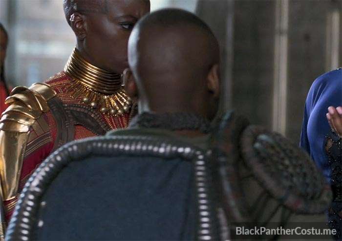 During meetings at the palace, W’Kabi wears one blanket (usually hanging from his shoulder harness). It’s much easier to see the parts of his costume during these scenes.